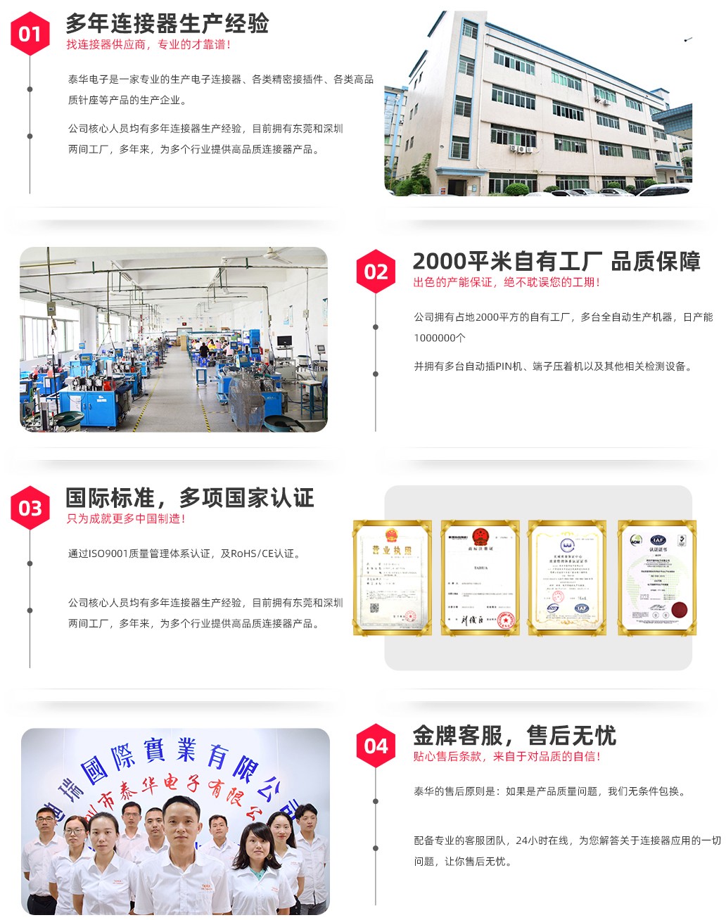 深圳市泰華電子有限公司15年專注連接器,多來成功為全國2000家大中小型企業(yè)提供專業(yè)的技術(shù)和服務(wù)。本公司具備先進的生產(chǎn)設(shè)備,標(biāo)準(zhǔn)化生產(chǎn)流程接插件日產(chǎn)100萬。所有產(chǎn)品通過ISO9001、ROHS等認證,自成立以來一直秉承品質(zhì)為先,客戶至上的理念。